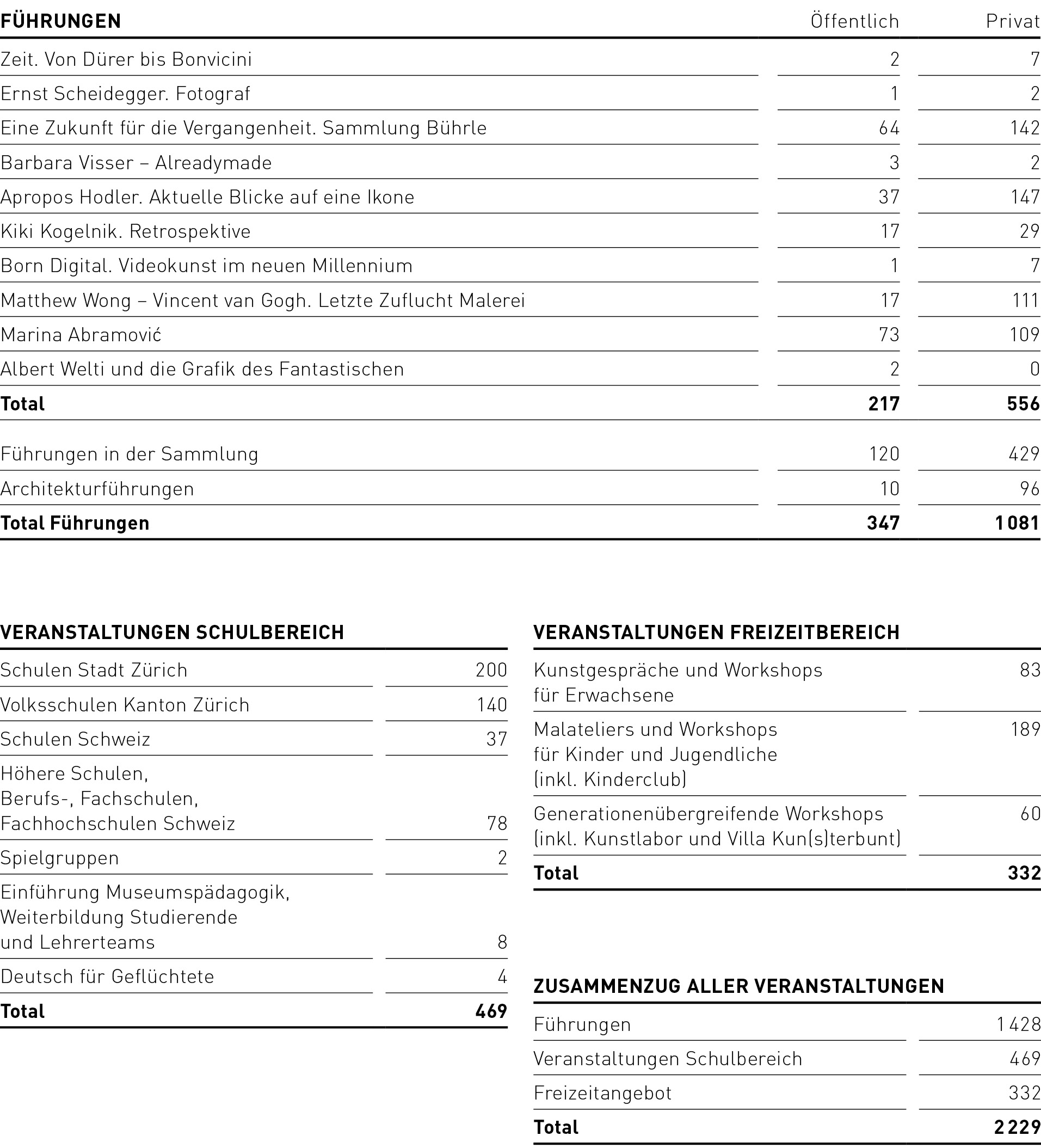 In den Ausstellungen fanden 217 öffentliche und 556 private Führungen, in der Sammlung 120 öffentliche und 429 private Führungen statt, dazu kamen 10 öffentliche und 96 private Architekturführungen. Dies ergibt ein Total von 1 428 Veranstaltungen. Wir danken unserem Kunst- und Architekturvermittlungsteam für den engagierten und kompetenten Einsatz.