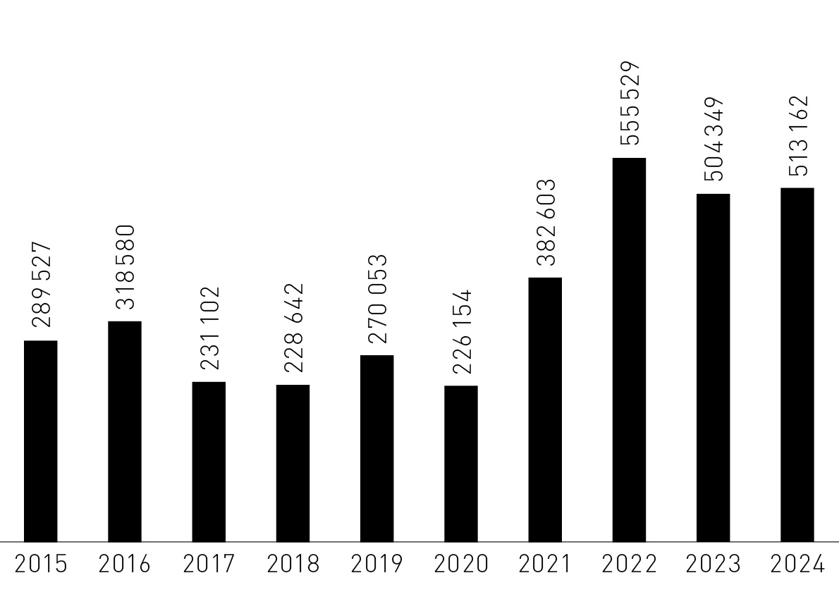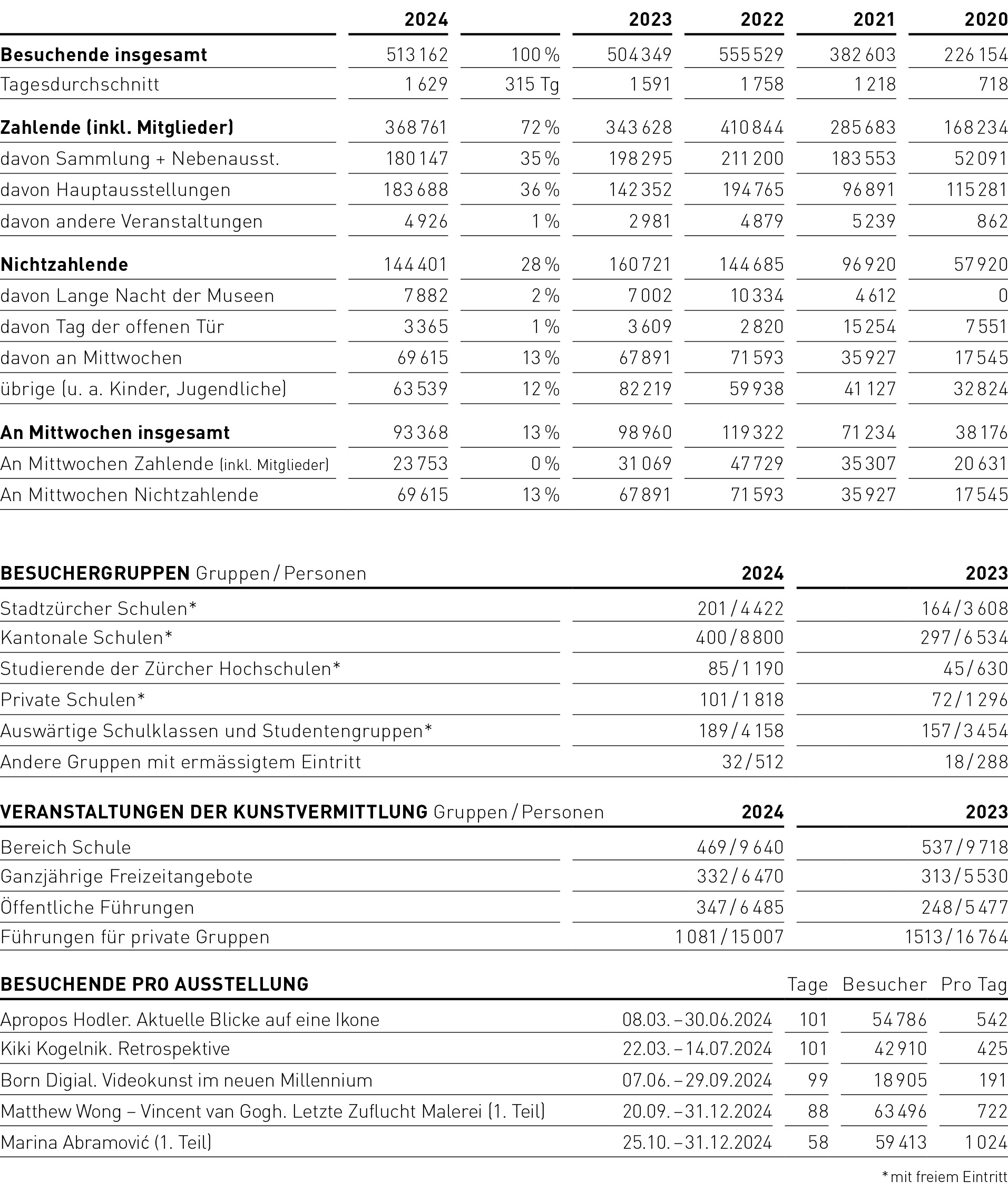 Erfreut sind wir über die konstant hohe Zahl (2024: 30 028) an Besuchen von Schülerinnen, Schülern und Studierenden (2023: 25 240) im Kunsthaus. Ansteigend ist die Frequenz der nichtzahlenden Besuchenden. Diese lag im Jahr 2024 bei 144 401, davon fielen 69 615 auf Besuche des Gratis-Mittwochs. Dennoch konnte das Kunsthaus die Einnahmen aus Tickets im Vergleich zum Vorjahr um CHF 977 939 auf CHF 5 534 047 erhöhen.