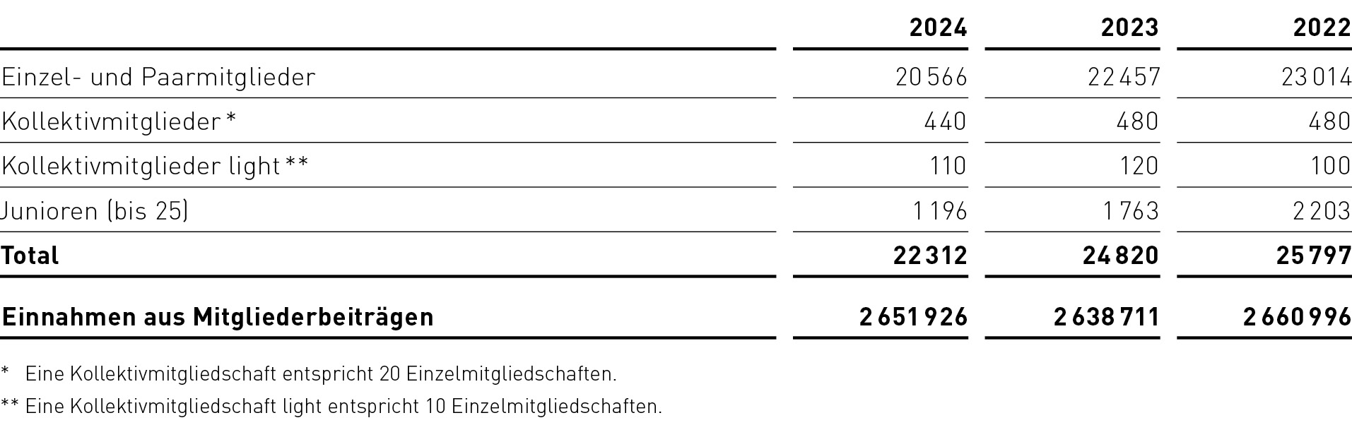 Die Mitgliederzahl verzeichnete im Vergleich zu 2023 einen Rückgang von 2 508 Personen (–10 %) auf insgesamt 22 312. Rückgänge gab es bei den Junioren: Nach dem Wegfall der Vergünstigung von CHF 20 sowie dem Erreichen des 25. Lebensjahres schlossen viele keine anschliessende Erwachsenenmitgliedschaft ab. Die Juniorengruppe schrumpfte daher um 567 Mitglieder (–32 %). Auch bei den Einzelmitgliedschaften zeigt sich ein Minus von 939 Personen (–8 %), während sich bei den Paarmitgliedschaften ein Rückgang von 952 Mitgliedern (–9 %) abzeichnete. Die Abwanderung ist auf mehrere Faktoren zurückzuführen: Zum einen fallen die oben aufgeführten Preiserhöhungen bzw. der Wegfall der Vergünstigung für langjährige Mitglieder ins Gewicht. Auf der anderen Seite konnten wir erfreulicherweise einen deutlichen Anstieg an Eintritten verzeichnen, sodass vermutlich einige Mitglieder nach einer Kosten-Nutzen-Rechnung den mehrfachen Einzeleintritt einer Mitgliedschaft vorzogen.
